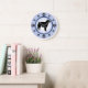 Les propriétaires et les amoureux de les chiens de Borzoi apprécieront ce design moderne amusant avec une silhouette de Borzoi et des empreintes de pattes représentant les chiffres sur le visage de l'horloge, avec un arrière - plan de bleu et un anneau bleu foncé.