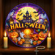 Cette horloge festive d'Halloween présente un château hanté au centre, avec une lune géante pleine et des chauves-souris volant à travers le ciel derrière elle. La scène se déroule dans une nuit sombre et mystérieuse, entourée de lumières jack-o-lanternes et de fantômes à l'aspect convivial. La face de l'horloge est encadrée par une bordure violette vibrante et comporte un grand panneau stylisé "HAPPY HALLOWEEN". L'ambiance générale est à la fois éffrayante et festive, avec des étoiles et une toile d'araignée qui viennent compléter le thème d'Halloween.