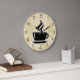 Kitchen wall clocks with brown and cream colors and image of a fresh coffee on the clock face in this household wall decor clock design for your kitchen, bathroom, or any room in your house you want to add some food and drink related decoration.