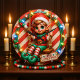 Cette horloge festive présente un elfe gai avec des joues roses et des oreilles pointues, portant une tenue rayée rouge et blanc, et un chapeau de Père Noël. L'elfe est assis sur une balançoire en bois, suspendue devant un arrière - plan rayé de sucre de canne rouge et blanc. La scène est ornée de lumières de Noël, saintes, et d'une petite pancarte qui dit "Joyeux NOËL". Les aiguilles de l'horloge sont noires, et les chiffres sont stylisés dans une police festive, le tout encadré dans une bordure circulaire.