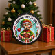 Il s'agit d'un design graphique ludique et circulaire avec un tricot humoristique et un thème de Noël. L'image centrale présente une caricature d'un elfe de Noël avec une expression grincheuse ou "point de repos". L'elfe porte un casquette vert avec un pom-pom rouge et tient une grande boule de fil rouge et d'aiguilles de tricot. L'elfe est assis sur le dessus d'un cadeau emballé, et est flanqué de sucres de canne et de saints. L'expression "REPOUSSER LE VISAGE DE POINTE" se trouve en haut du cadre circulaire. L'arrière - plan est d'un bleu clair avec des flocons blancs.