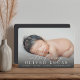Un élégant design de faire-part de naissance avec un fond plein de saignement photo horizontale ou orientée paysage avec "introduction [nom]" en bas dans le script de calligraphie chic et le lettrage serif classique. Les statistiques de naissance de votre bébé et la signature de votre famille apparaissent en dessous. Ajoutez trois photos carrés supplémentaires à l'arrière.