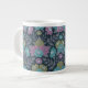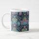 Cette tasse géante présente des fleurs dans les tons violets, bleus et vert olive entourées de frondes de fougères violettes muettes et de feuilles sur un arrière - plan bleu foncé.