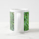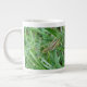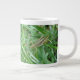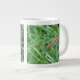 Cette énorme tasse présente une macro photo détaillée d'une petite sauterelle verte avec des marques marron mottées sur l'herbe. Sur la photo vous pouvez voir le détail des jambes articulées, des antennes longues et des yeux noirs et or de la sauterelle.