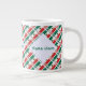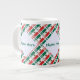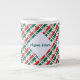 Personalized name on a giant coffee mug featuring a diagonally tiled version of the Mexican Flag, with the word, MEXICO, underneath, in the colors of the flag. A fractal of white squiggly squares holds a place for your name, to create a personalized look for you or a gift for travelers or a heritage gift. The Mexican flag is three vertical stripes. One is red, one is white, and one is green. The white stripe is in the center and holds an emblem with an eagle. Great housewarming gift. Fun to use on Cinco de Mayo.