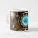 Turquoise lenses with antique watch with brass gears and golden keys on rusty, brown background. Steampunk style.