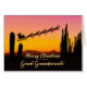 Une carte de Noël pour vos arrière grands-parents montrant Père Noël survolant le désert. Beaucoup de gros cactus sont vus en silhouette. Souhaitez un joyeux Noël du désert avec une belle carte couleur coucher de soleil.