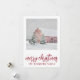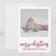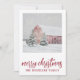 Simple grange rouge dans la carte de Noël de vacances de neige hivernale. Ajoutez votre nom de famille. Style de campagne.