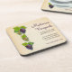 Eine Weinrebe mit vier Weintrauben, die entlang der links Seite dieses Korkweins-Untersetzer verläuft. Die Traube schlängelt sich hinter den Trauben vor einem Pergament-Hintergrund. Ein großartiges Werbegeschenk für einen Bar, eine Weinhandlung, einen Weinberg oder einen Winzer. Verfügbar mit passenden Produkten.