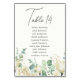 Ces cartes de graphique de placement de table élégantes sont parfaites pour un mariage simple et rustique ou toute occasion spéciale. Le design floral présente des magnolias et de l'eucalyptus à l'aquarelle avec de la verdure. Personnalisez et ajoutez chaque numéro de table dont vous avez besoin à votre panier individuellement.