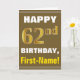 Ce simple design de carte de voeux sur le thème de l'anniversaire présente un voeu d'anniversaire chaleureux comme "HAPPY 62nd BIRTHDAY, First-Name!" sur le devant, en texte gras sur un arrière - plan de couleur marron. Le numéro d'anniversaire a un look de couleur imitation or. Le nom sur le devant peut être customisé. L'intérieur comporte un message d'anniversaire qui peut être personnalisé. Une carte de voeux comme celle-ci pourrait être une façon amusante d'offrir des voeux d'anniversaire à quelqu'un qui célèbre son soixante-deuxième anniversaire. [~Z0000281]