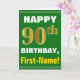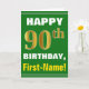 Ce simple design de carte de voeux sur le thème de l'anniversaire présente un voeu d'anniversaire chaleureux comme "HAPPY 90th BIRTHDAY, First-Name!" sur le devant, en texte gras sur un arrière - plan de couleur verte. Le numéro d'anniversaire a un look de couleur imitation or. Le nom sur le devant peut être customisé. L'intérieur comporte un message d'anniversaire personnalisable. Une carte de voeux comme celle-ci pourrait être une façon amusante d'offrir des voeux d'anniversaire à quelqu'un qui célèbre son quatre-vingt-dixième anniversaire. [~Z0000279]