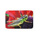 Diese Tierbadematte ist mit einem glänzenden, grünen, gelben und schwarzen Grasshopper in der lila Mitte einer Blume mit prächtigen roten Blütenblättern bestückt.