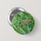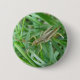 Dieser brillante Knopf zeigt ein detailliertes Makrofoto eines kleinen grünen Grasshoppers mit braunen, mottelierten Markierungen auf dem Gras. Auf dem Foto sehen Sie die Details der geflochtenen Beine, lange Antennen und schwarz-goldene Augen des Grashüpfers.