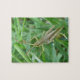 Dieses phantastische Rätsel zeigt ein detailliertes Makrofoto eines kleinen grünen Grasshoppers mit braunen, mottelierten Markierungen auf dem Gras. Auf dem Foto sehen Sie die Details der geflochtenen Beine, lange Antennen und schwarz-goldene Augen des Grashüpfers.