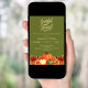 Ein moosgrüner Hintergrund. Die Einrichtung ist mit Kürbissen und orangen und gelben Blumen geschmückt. Personalisieren Sie die Party-Details und fügen Sie sie hinzu. Text-Skript: Dankbar und gesegnet.