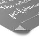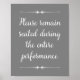 Dieses bezaubernde graue Plakat enthält den Satz "Bitte bleiben Sie während der gesamten Aufführung sitzen" in einem handgeschriebenen, weißen Schriftart, der oben und unten betont wird. Das ist eine humorvolle Art, ein Badezimmer oder ein Waschraum zu dekorieren.