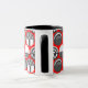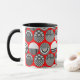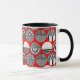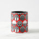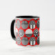 Diese Tasse hat ein geometrisches Design von Ovalen mit verschiedenen Mustern in Grau in jeder Hälfte, alles auf einem Feld rot.