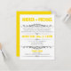 Moderne Einladungen für Hochzeiten, bei denen das Ehepaar eine Hochzeit in Urlaubsort oder eine kleine private Hochzeitsfeier veranstaltet und nur zum Empfang einlädt. Die Typografie auf der Vorderseite dieser Einladungen ist in gelben und grauen Schriftart gestaltet, und die Rückseite ist gelb mit optional grauem Text für potenzielle UAWG.