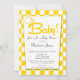 Eine niedliche, gelbe "Oh Baby" geschlechtsneutrale Babydusche mit einem karierten gelben und weißen Hintergrund.
