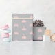 Graues Packpapier mit rosa Zirkuszelten. Dieses Papier ist sehr niedlich für die Verpackung Ihrer Babygeschenke.