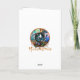 Alaskan Gray Male Wolf kommt von hinter einem Baum, als der Schnee in einer Kiefernwald-Winterschneelandschaft Set fällt, während sein Vorfahren Wolfsmeister sich umschaut. Lichtförmige Orb in einen Weihnachtsbaum mit weißer, türkisfarbener und liter bläulicher Farbpalette. In der Karte eingebetteter Text: "Möge die Magie der Saison dein Herz mit Freude füllen."