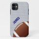 Custom American Football Fan iPhone 5 Gehäuse, mit Grafik von einem grauen Jersey Look Hintergrund. Die Grafiken eines Fußballs schmücken die untere rechte Ecke des Gehäuses, und der links, blaue Text ist auf eine individuelle Gestaltung vorbereitet. Großartiges Telefongehäuse für Sportfans oder Fußballspieler.