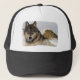 Grauer Wolf oder Timberwolf, die in den Schnee Truckerkappe
