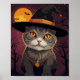 Graue Halloween-Katze mit leuchtend orangefarbenen Augen, die einen schwarzen Hexenhut mit Vollmond in einem spöttischen Friedhof an Halloween-Nacht trägt. Macht eine Geschenkidee für Katzenliebhaber zu Halloween.