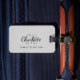 Graue Imitate aus Leder als Hintergrund. Personalisieren und fügen Sie Ihren Vornamen, Monogramm Buchstaben und vollständigen Namen auf der Vorderseite. Ihre Kontaktinformationen auf der Rückseite. Schwarzer Text.