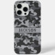 Customize this gray camouflage iPhone 15 pro max case with your name in a trendy modern CAP font in dark gray on light gray. It's masculine and perfect for your favorite military, hunting, country or outdoorsman!