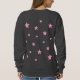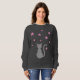 Ein Silhouette Cartoon einer grauen Katze mit rosa Augen. Ein rosa Stern hängt vom Schwanz der Katze. Ein Sternenhimmel von passenden Sternen ist vorne und hinten.