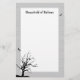 Eine Privatpapiere mit einem hellgrauen Rand, einer schwarzen Silhouette eines toten Baumes mit einer Eule, die auf einem der Zweige sitzt, und zwei Fledermäuse, die an den Kanten fliegen. Die Überschrift ist leicht anpassbar / personalisiert, mit der Vorgabe von "Household of Hallows". Die einfachen schwarzen Konturen machen dieses Halloween-Themenpapier für einen etwas spitzigen Herbst oder Herbst-Einsatz geeignet.