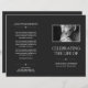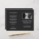 Sauberes und minimalistisches Begräbungsprogramm in dunkelgrau und weiß, mit eleganten Schriftart. Fügen Sie ein Foto Ihrer Lieben zusammen mit ihrem Namen und Lebensjahren hinzu. Auf der Rückseite können Sie das Programm schreiben und schreiben. Falten Sie es selbst für ein praktisches Programm!
