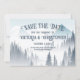 Ein mysteriöser, grauer Wald mit einem romantischen, weißen Nebel um die Kiefern und den Berg im Hintergrund machen eine große Wildnis Save the Date zu einer Winterfeier in den Bergen. Die elegante Typografie zeigt alle Kappen mit einer schönen Signatur, die auf den Hauptstädte geblüht wird.