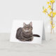Liebenswürdig gray tabby cat sitting down, looking up on white background