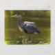 Auf dieser Postkarte befindet sich der große Blaue Heron, ein großer Watvogel in der Heronfamilie Ardeidae, der in der Nähe des offenen Wassers und in Feuchtgebieten verbreitet ist. Er ist der größte nordamerikanische Held. Zu den bemerkenswerten Merkmalen zählen Latschfedern, rot-braune Oberschenkel und ein paarweise rot-brauner und schwarzer Streifen auf den Flanken; der Hals ist rostig grau, schwarz-weiß streut die Vorderseite ab; der Kopf ist blasser, mit fast weißem Gesicht, und ein Paar schwarzer Schwaden, die von knapp über dem Auge bis zum Hinterkopf laufen. Die Federn am unteren Hals sind lang und plume-ähnlich. Da dies die Brutzeit ist, hat er auch Trachten auf dem unteren Rücken und eine orangefarbene Rechnung. Er ist in flachem Wasser stehend, und seine Federn werden durch das helle Sonnenlicht wieder beleuchtet.