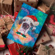 Great Dane Breed Hunde Weihnachten zeigt eine Aquarellfarbe eines großen Dänen mit einem roten Weihnachtshut, einem roten Weihnachtskragen und einer galaxischen Wasserfarbe.
