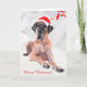 Ein niedlicher Großer Dane Hund sitzend mit roter Weihnachtsmannmütze und Red Christmas Ornament, ein perfektes Weihnachtsgeschenk!