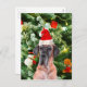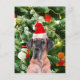 Ein niedlicher Großer Dane Hund mit roter Weihnachtsmannmütze und posiert vor dem schön dekorierten Weihnachtsbaum, mit Geschenkboxen Schneemann, Teddy Bär, Weihnachtsschmuck. Ein perfektes Geschenk zu Weihnachten!