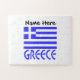Drapeau grec et le mot, ou nom GRÈCE ci-dessous en bleu. Le drapeau montre des bandes bleues et blanches avec une croix bleue et blanche dans la zone supérieure droite. Au-dessus, ajoutez votre nom pour une touche personnelle ou créez un cadeau personnalisé d'un puzzle. Amusant pour les réunions de famille, les groupes de voyage et partager votre amour et votre fierté de votre patrimoine, de votre ascendance et de votre culture. Idéal pour célébrer la Journée de l'Oxi (Ohi ou Ochi, aussi).