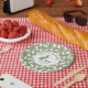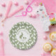 A lovely Easter design in a sage green and white color scheme featuring Destei's repeating bunny silhouettes that create a cute and festive background. A white circle with a green border at the center contains a bunny motif paired with two Easter egg silhouettes and two personalizable text areas, perfect for a Happy Easter greeting and a family name.