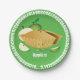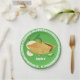 Papierplatte mit einer lächelnden, fast ganzen, grünen, Apple-Kuchen-Cartoon-Abbildung. Die Zahlen für Pi sind für mehrere Dezimalstellen sichtbar. Dieses "Apple-Konzept" soll den Spaß am Kochen und Kalkulieren verbinden. Es macht Spaß und es ist nervös. Zwei Dinge, die sich wunderbar miteinander verbinden.