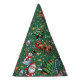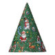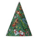 Christmas-themed pattern featuring Santa Claus, reindeer, snowmen, elves, Christmas trees, candy canes, and snowflakes on a green background