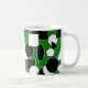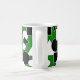 Cette tasse a une conception Bauhaus de triangles, cercles, rectangles et pentagons en noir et blanc sur un champ de vert.