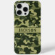 Customize this multi-hued green camouflage iPhone 15 pro case with your name in a trendy modern CAP font in dark green on light green. It's masculine and perfect for your favorite military, hunting, country or outdoorsman!