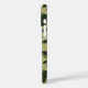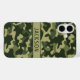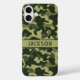 Customize this multi-hued green camouflage iPhone 16 plus case with your name in a trendy modern CAP font in dark green on light green. It's masculine and perfect for your favorite military, hunting, country or outdoorsman!