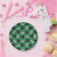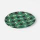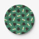 Graduation party paper plates printed with a green pattern of graduation caps and diplomas with a yellow ribbon.