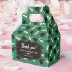 Graduation favor boxes printed with a green pattern of graduation caps and diplomas with a yellow ribbon. Customize the graduation themed favor boxes with the name of the graduate or the name of the celebration, and with the date.