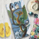 Grün kleiner Drache in einem Baum im Winter versuchen, Freunde mit drei Kicherwelten zu machen.